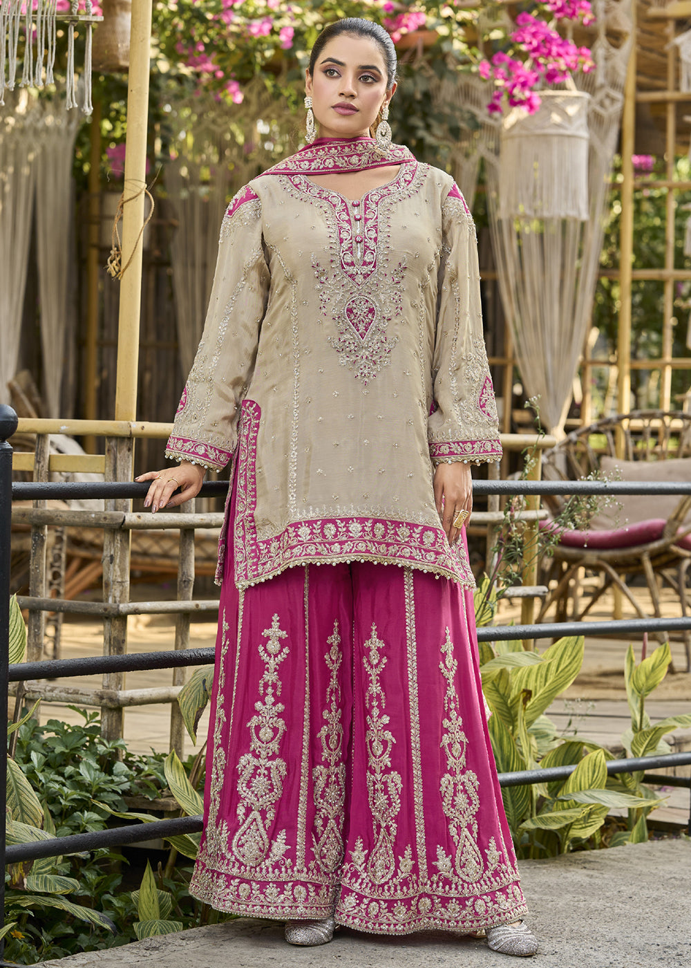 Dusty Cream & Pink Heavy Chinnon Palazzo Style Suit
