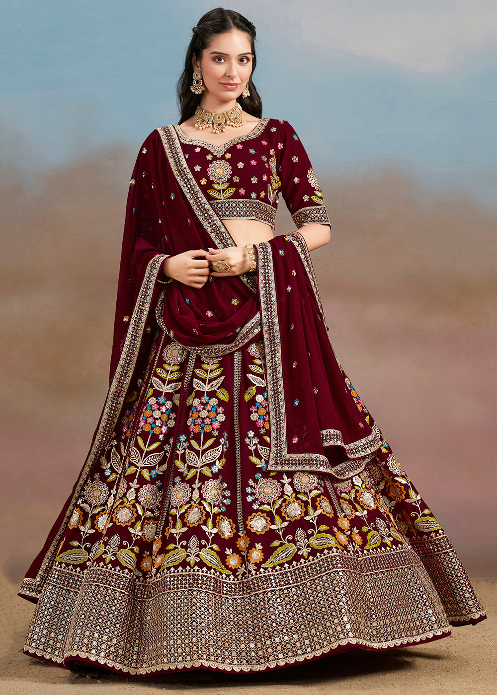 Maroon Multi Color Threads Work Festive Lehenga Choli