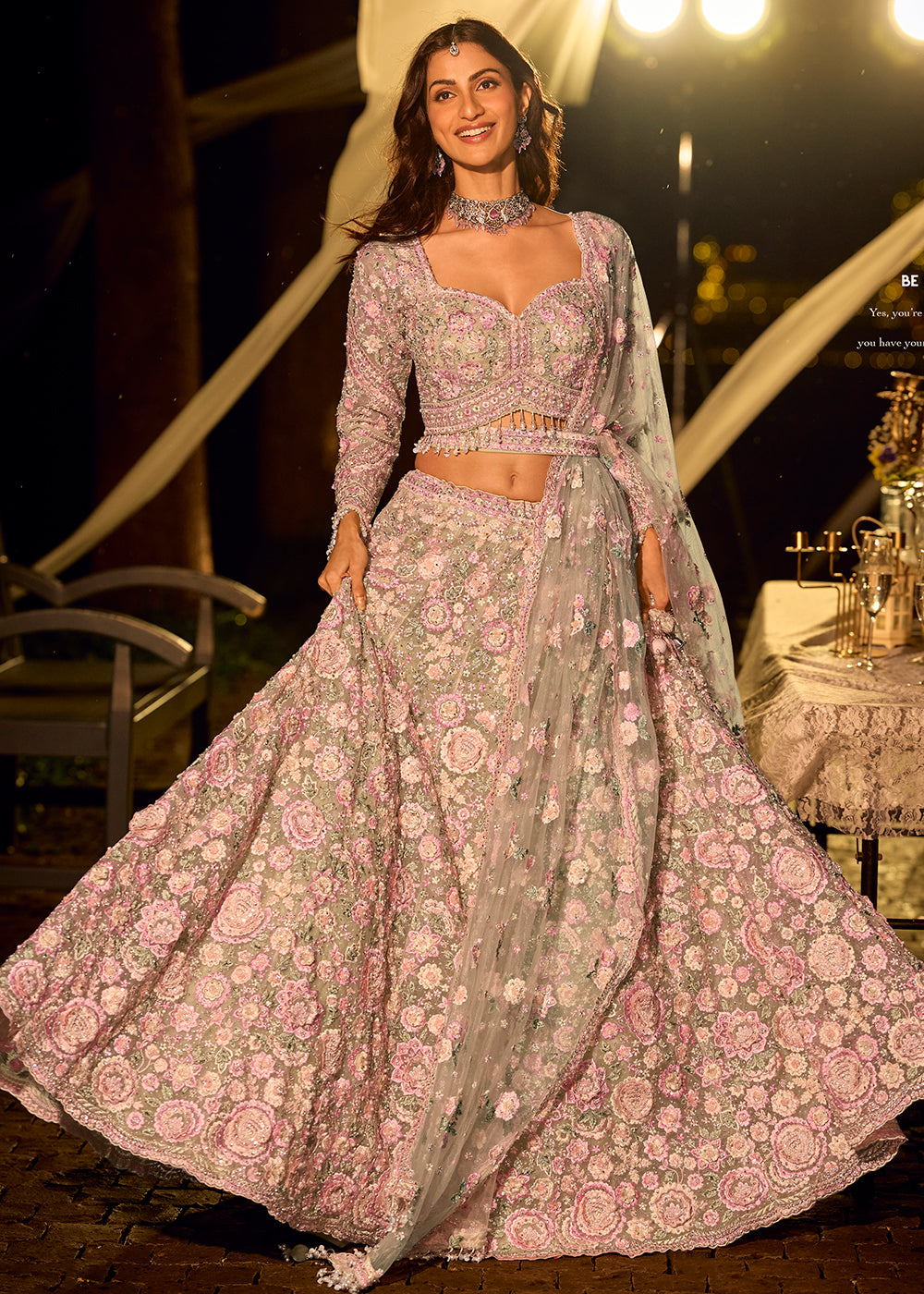 Shine with unmatched elegance in this Pastel Mint & Pink Pure Net Lehenga Choli by Empress, crafted exclusively for grand bridal receptions. The lehenga is lavishly adorned with full heavy handwork featuring beads, pearls, mirrors, and Swarovski diamond detailing on both the front and back, giving it a luxurious and radiant sparkle.
