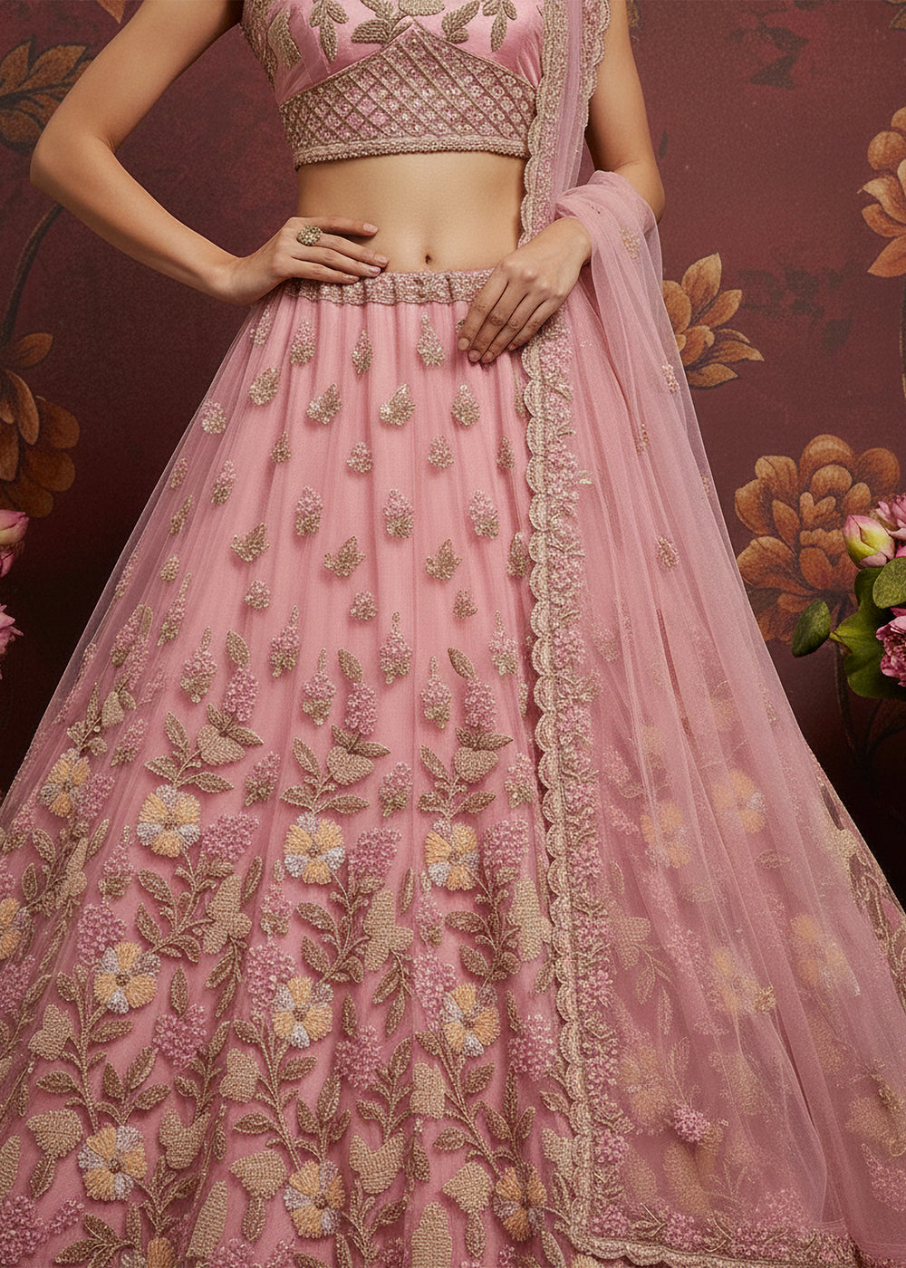 Carnation Pink Heavy Net Bridal Wear Lehenga Choli