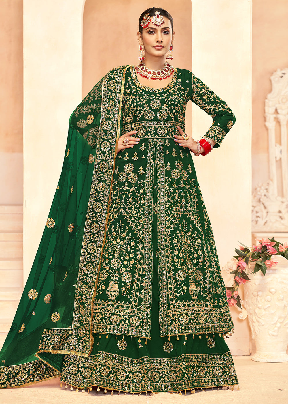 Perfect for wedding celebrations, this Empress creation makes a statement of refined luxury and traditional charm. Enhance its majestic allure by accessorizing with statement gold or kundan jewelry pieces and carefully curated accessories that complement the deep green hue. The premium velvet fabric provides sumptuous warmth and structure while maintaining an elegant drape that flatters all body types, making this ensemble an ideal choice for the discerning woman who desires to radiate regal presence and timeless elegance.