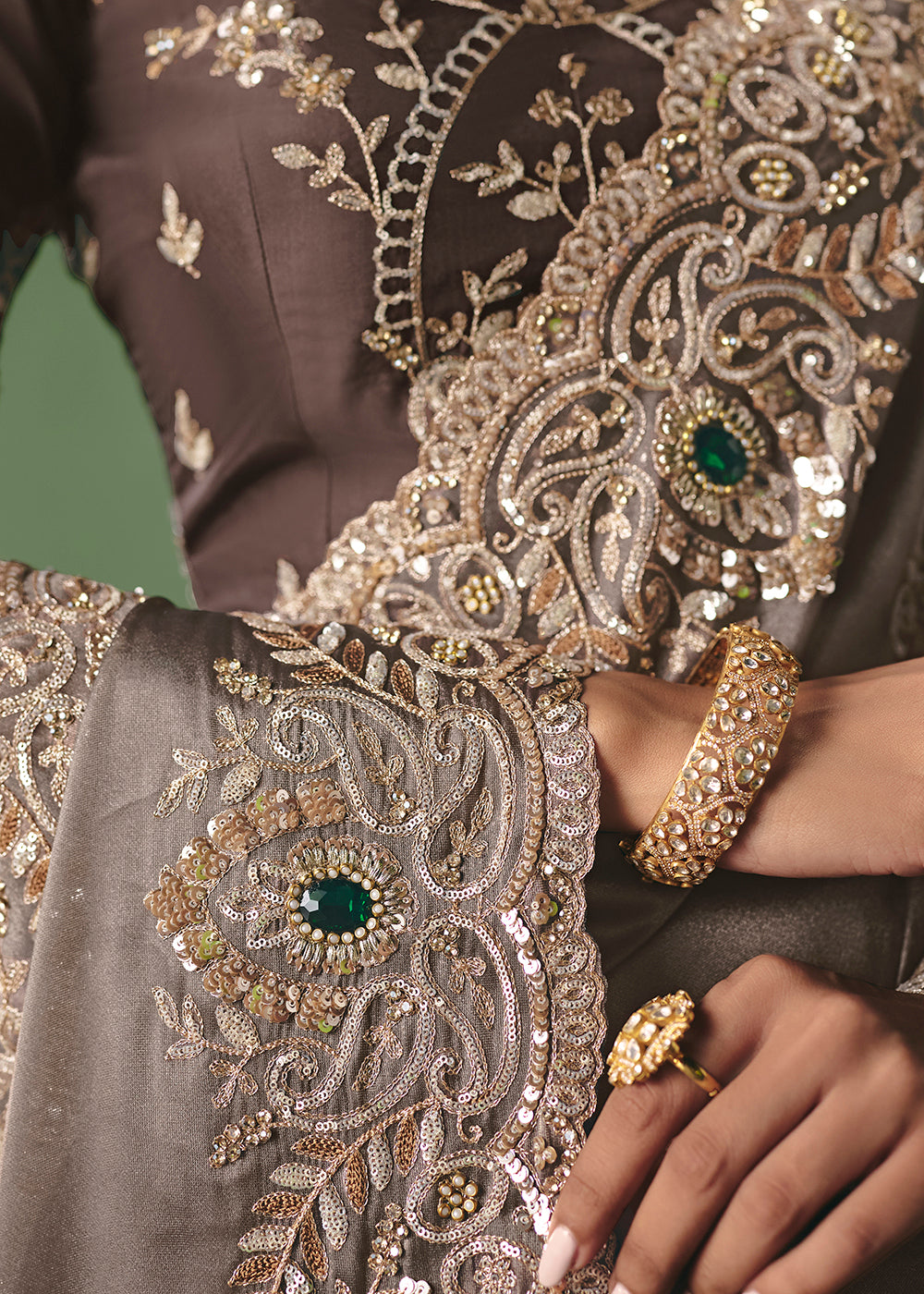Buy Now Dusty Grey Premium Fancy Fabric Designer Party Wear Saree Online in US, UK, Canada, France, Germany, Denmark, Netherland, Sweden & Worldwide at Empress