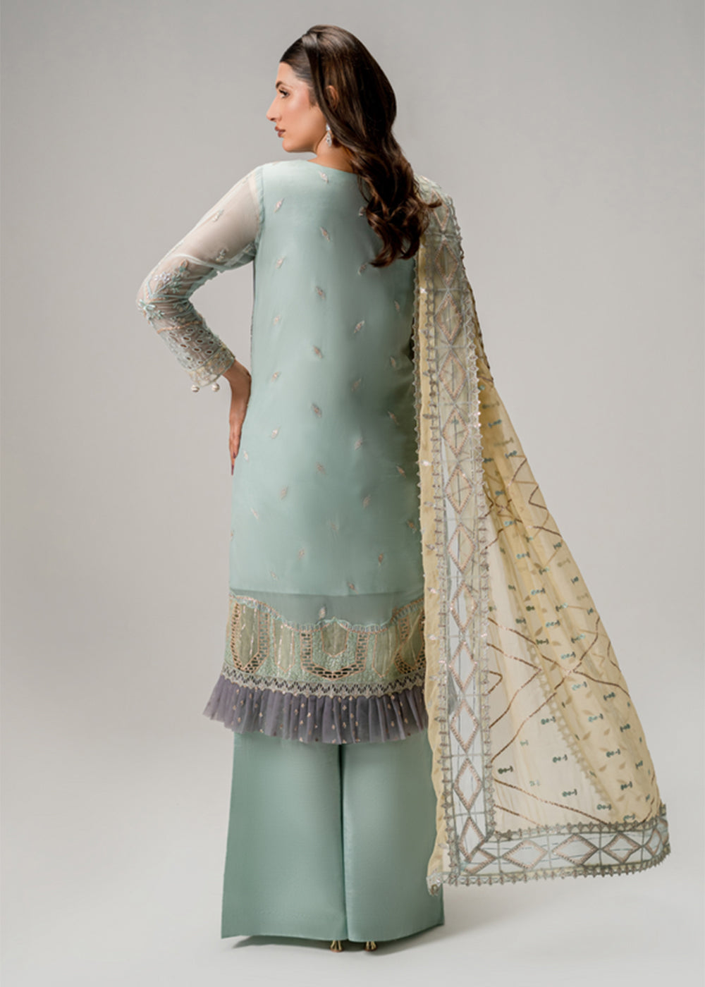 • The Luxury Pakistani Suit is made of high-quality Chiffon fabric, which is lightweight, flowy, and comfortable to wear by Zebtan Official.