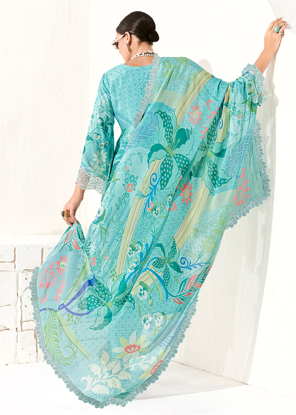 This complete outfit includes a matching pure muslin heavy pant style bottom and pure chinnon dupatta with digital prints and resham scalloped embroidered organza four-side borders. Ideal for function wear, parties, and casual wear, this blue salwar suit combines contemporary digital prints with traditional craftsmanship, becoming absolutely enchanting when styled with delicate jewelry and accessories.