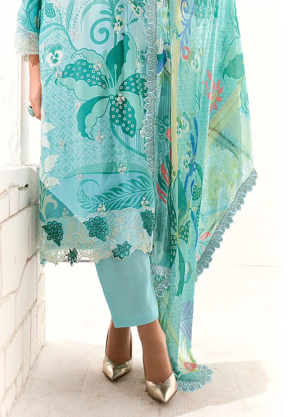 Discover ethereal elegance with this beautiful Blue Pure Muslin Salwar Suit by Empress. This exquisite ensemble features digital prints, embroidery buttis on front, and stunning resham scalloped embroidery with organza applique patch work on hemline and sleeves. The premium pure muslin fabric ensures breathable comfort and graceful drape perfect for all-day wear.