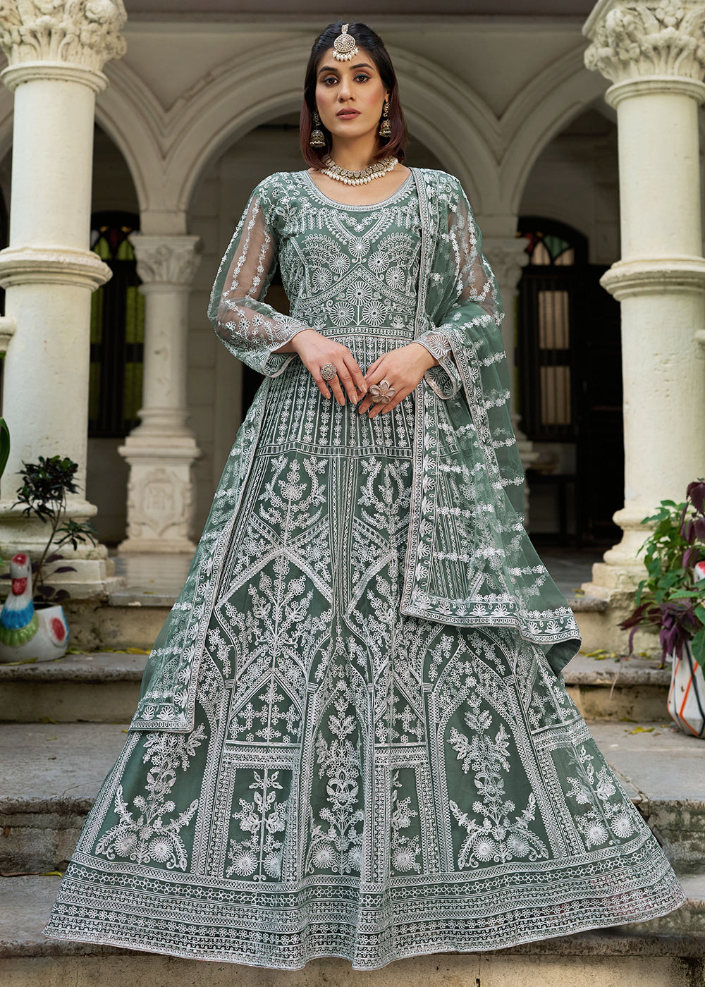 Moss Green Front & Back Diamond Work Wedding Anarkali Suit