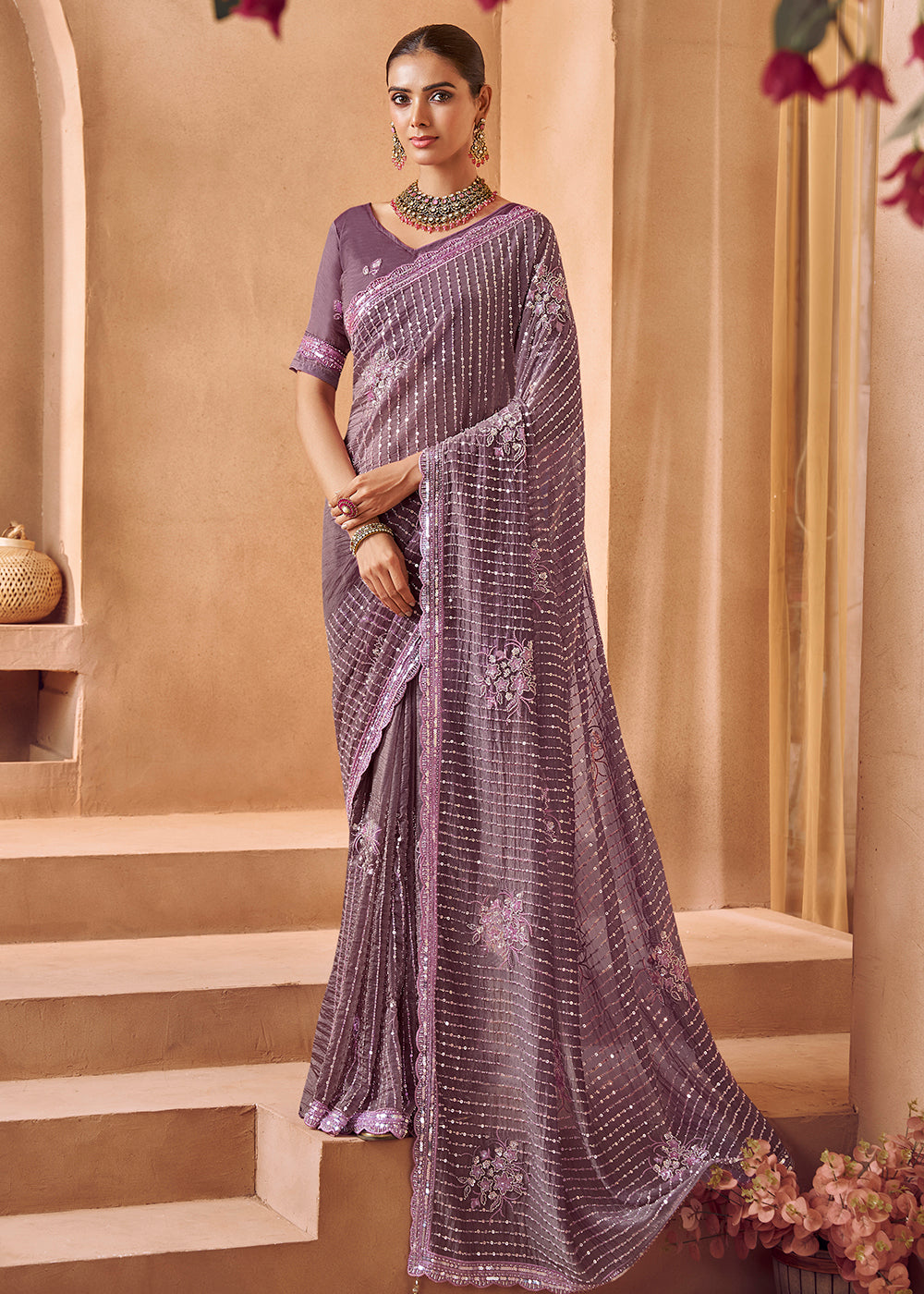 This complete designer outfit includes a matching embroidered blouse that creates harmonious coordination and elegant styling. Ideal for weddings and bridal events, this purple tissue silk saree combines traditional handcrafted artistry with contemporary bridal fashion, becoming absolutely captivating when styled with statement jewelry and accessories for unforgettable wedding elegance and celebration sophistication.