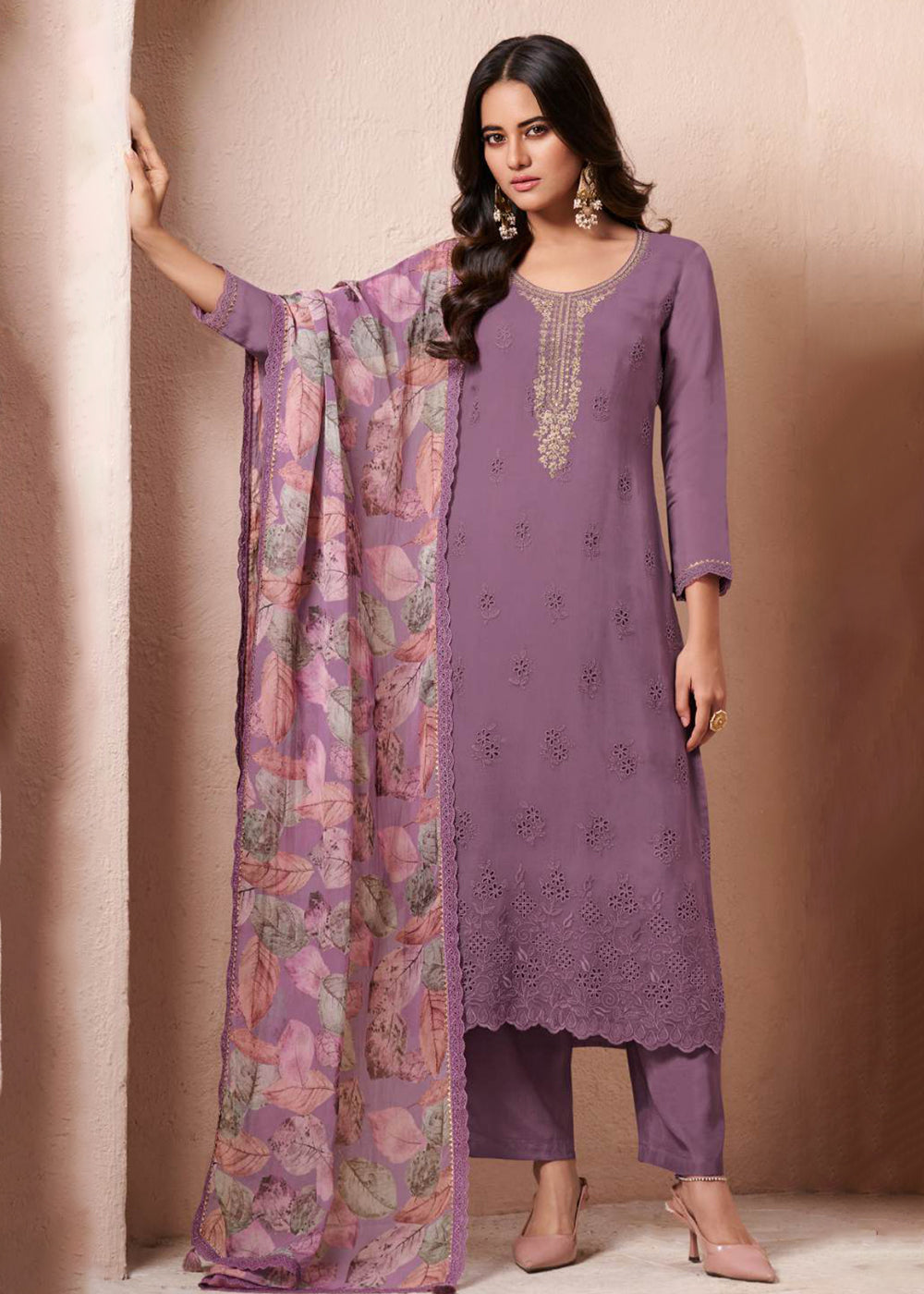 Schiffli Embroidered Purple Organza Straight Kurta Suit