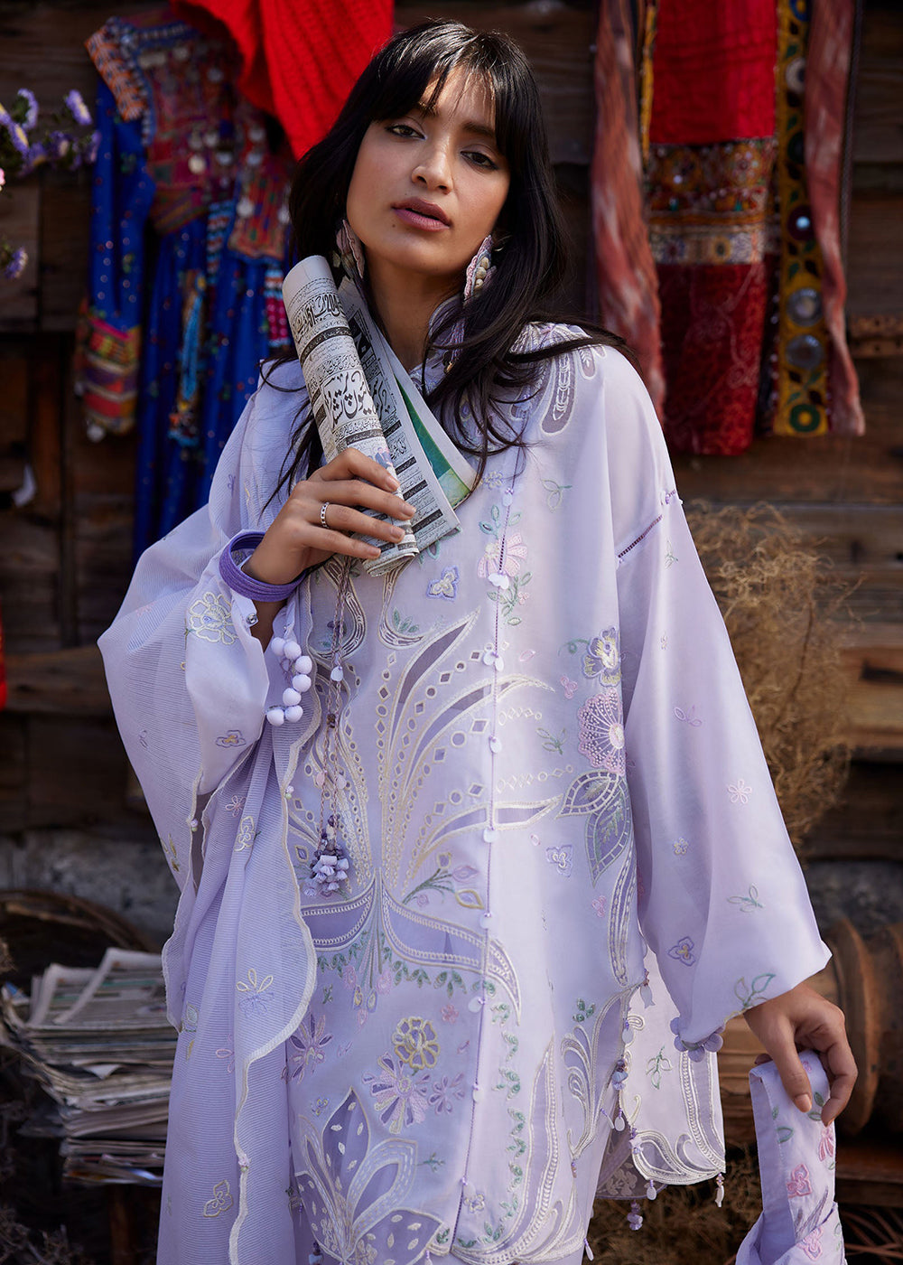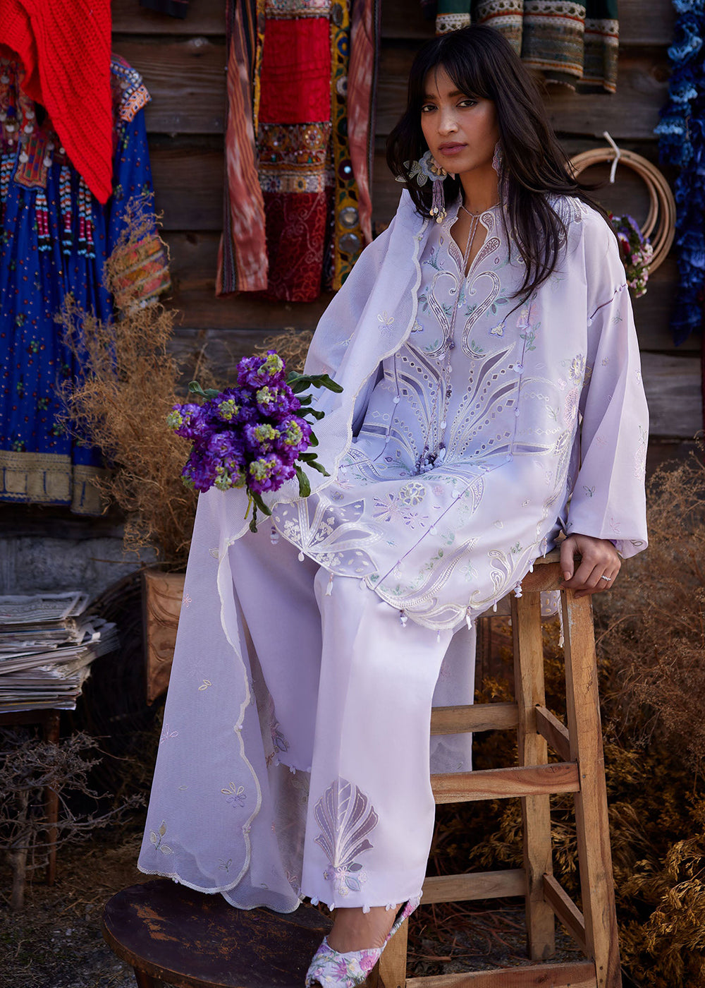 A vision of serene elegance, this soft lilac ensemble is delicately adorned with intricate floral and botanical embroidery in whispers of mint, blush, powder blue, and ivory. The pastel threadwork unfolds gracefully across the shirt, creating an aura of refined femininity and quiet charm.