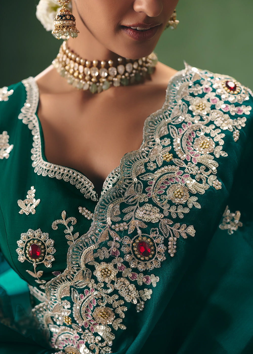 Make a graceful statement at every celebration with this Rama Green Fancy Designer Party Wear Saree by Empress. The saree is beautifully embroidered with sparkling stone work, delicate pearl detailing, and shimmering sequins, creating a glamorous and eye-catching party look.