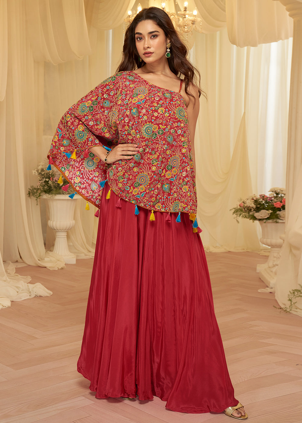 Buy Now Red Viscose Crepe Stylist Indo Western Palazzo Dress Online in Toronto, Newark, Katy, Houston, Fremont, Nevada, Boston, Utah, UAE & Worldwide at Empress.