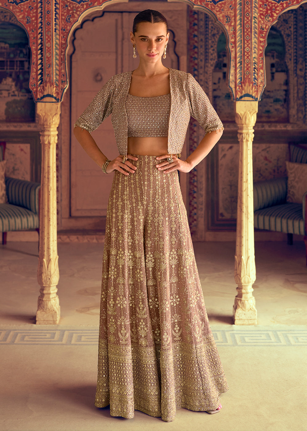 Rose Gold Crop Top Party Style Palazzo Suit with Jacket