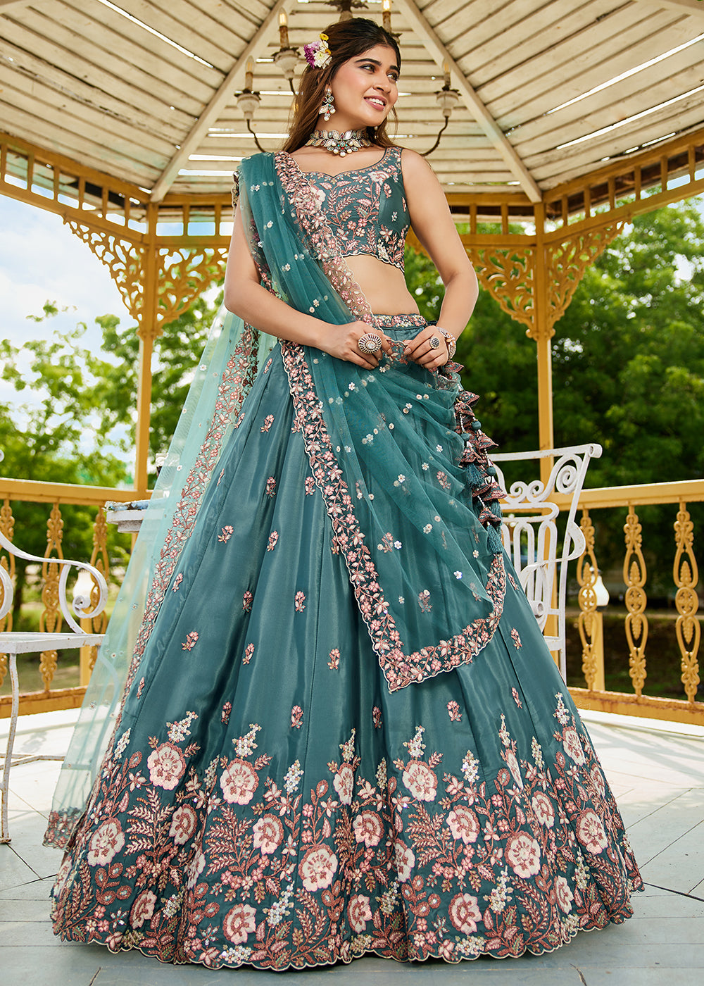 Teal Green Satin Embroidered Wedding Festive Lehenga Choli