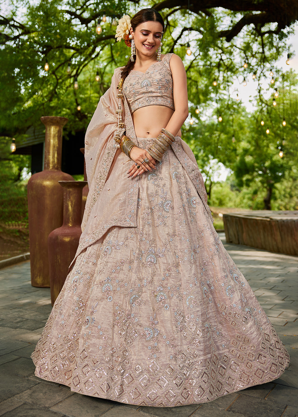 This elegant nude pink tissue lehenga choli epitomizes understated luxury with its soft, sophisticated hue and exquisite craftsmanship. The delicate sequins and cording threads work adds subtle glamour to the premium tissue fabric, creating a refined look that's perfect for wedding parties where timeless elegance is desired.