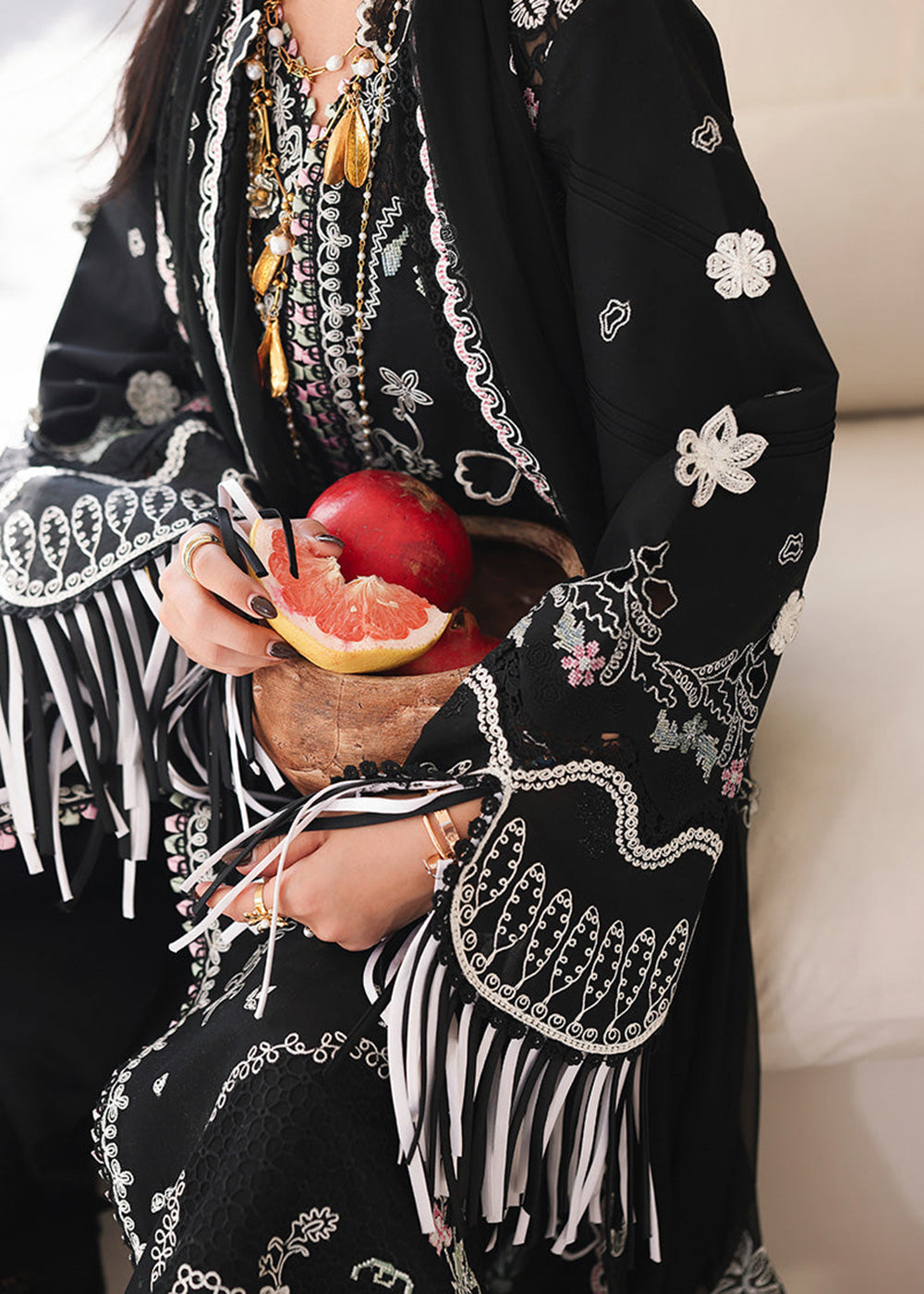1. Extra Tassels Hangings, frills, buttons if not mentioned as content of the Package are not Part of Package and are for display Purpose Only, which the Model displays in their Outfit. You can style Your unstitched Suits like the Models or Stitch it according to the Content Given with the Products. All Pakistani Brands Showcase the Best possible way You can stitch Your Outfits.