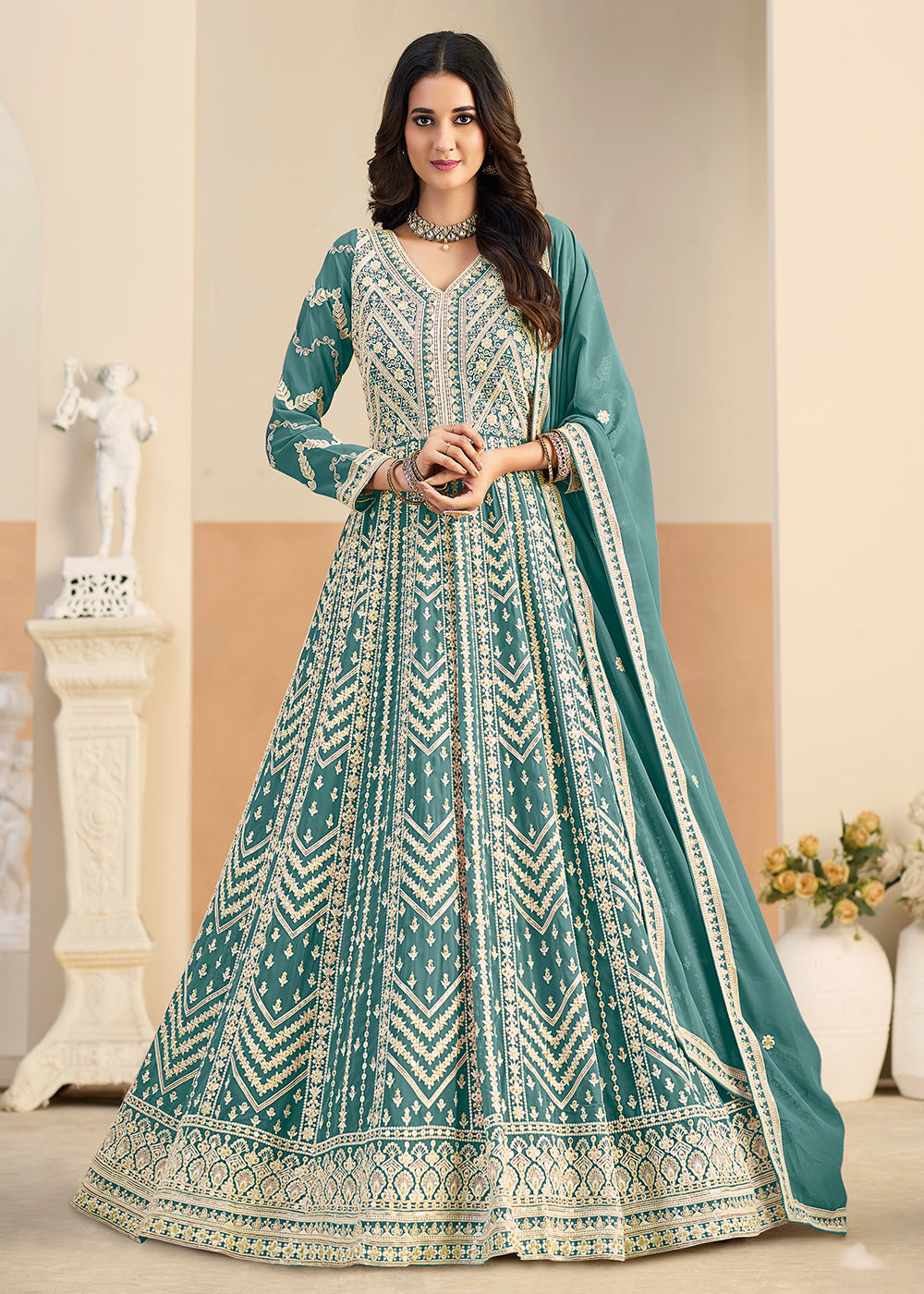 Pastel Teal Lucknowi Embroidered Georgette Anarkali Suit